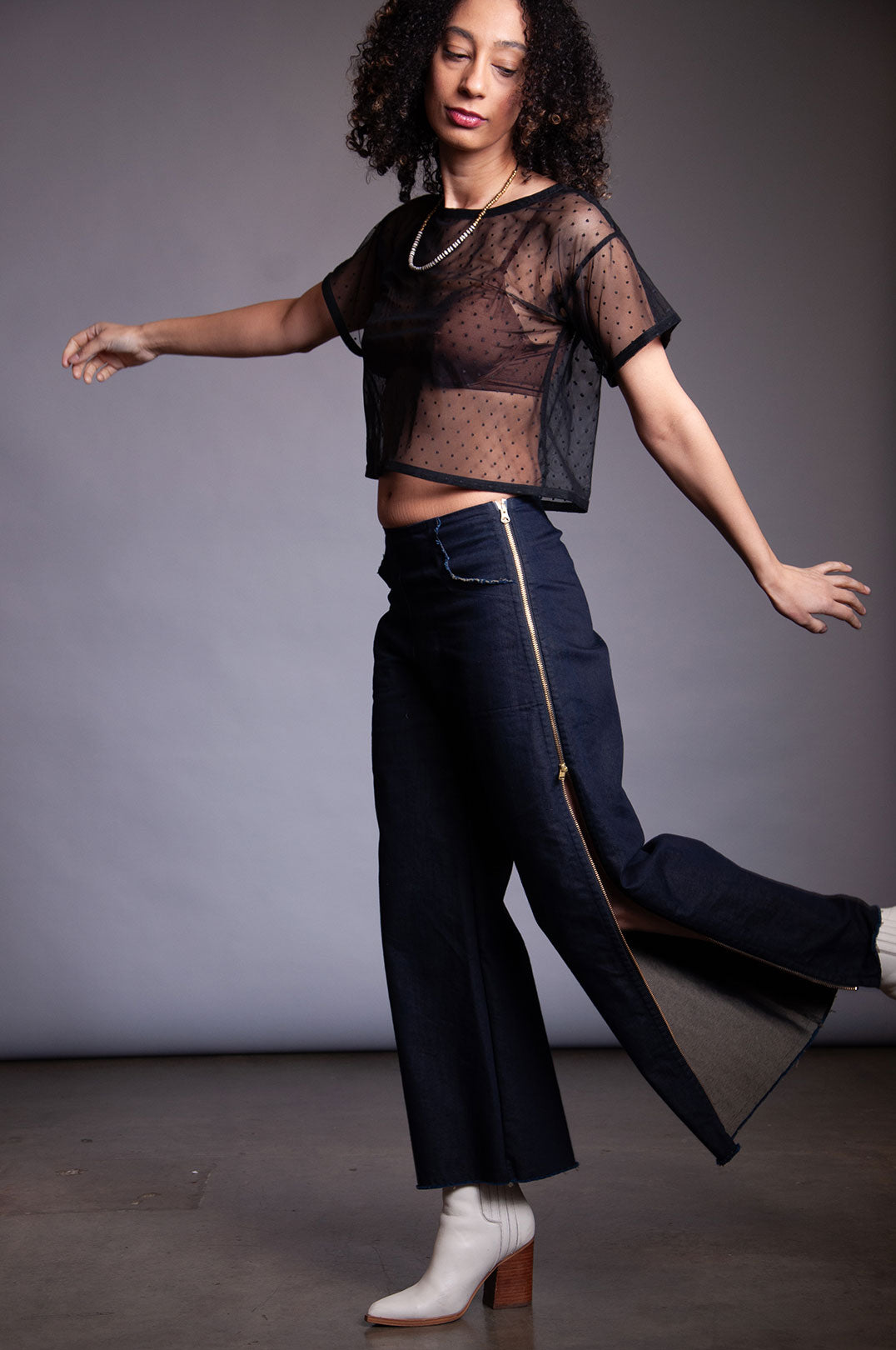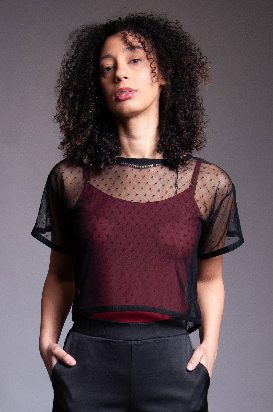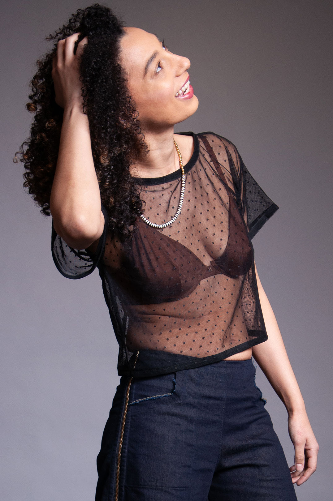 Short sleeve sheer black mesh top with mini dots. Can be worn with a bra or with a cami, colored, flesh toned, or black. Or experiment with layering over a dress or long sleeve!