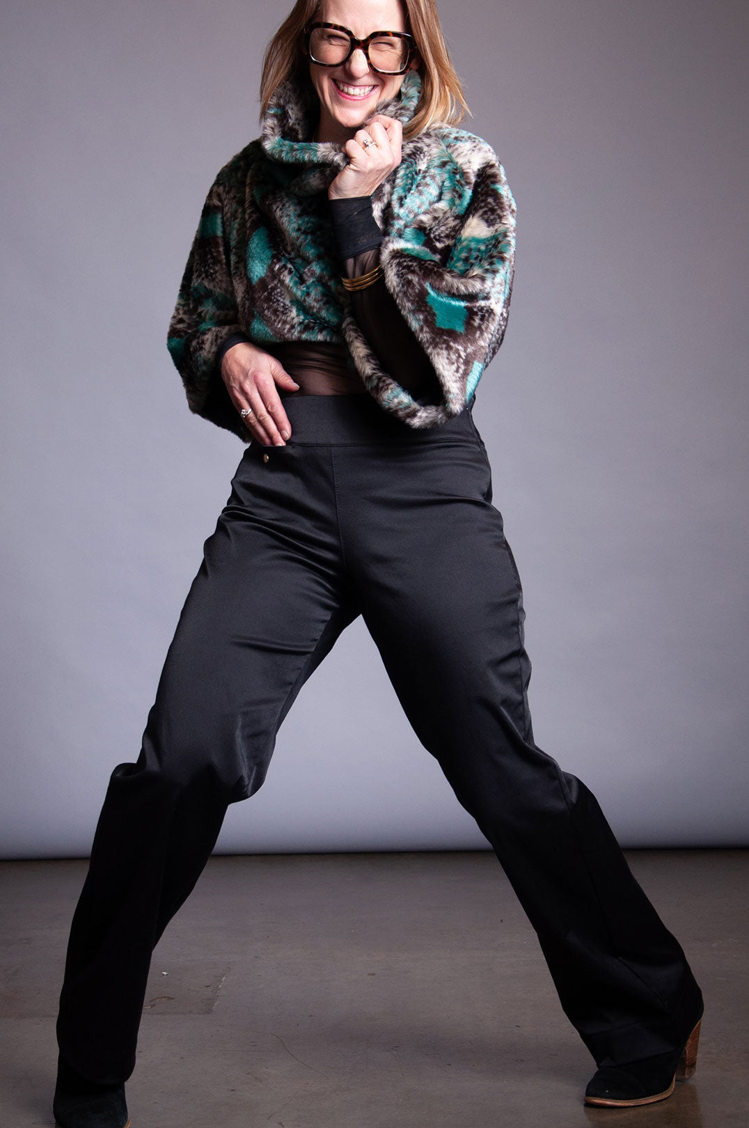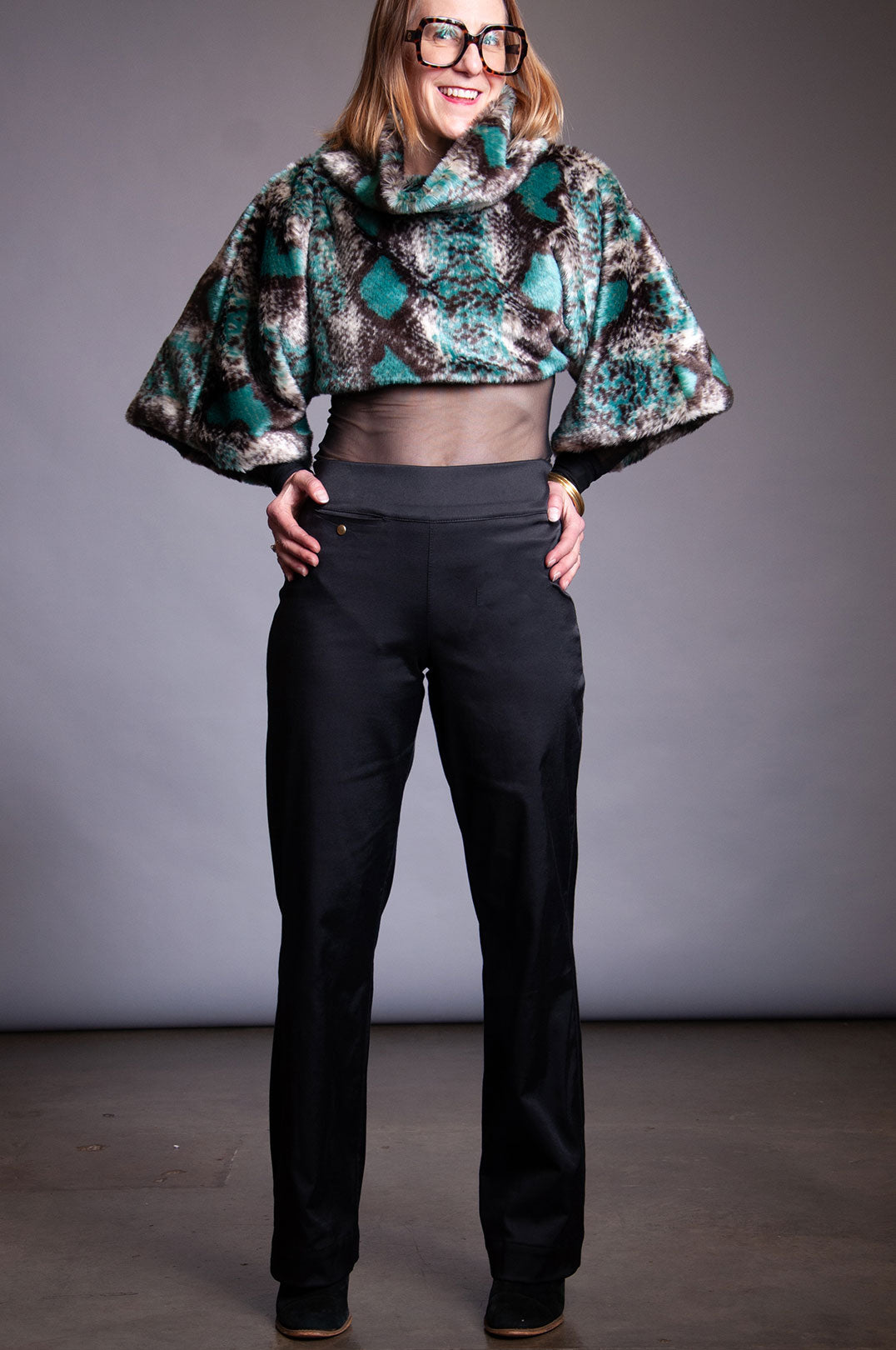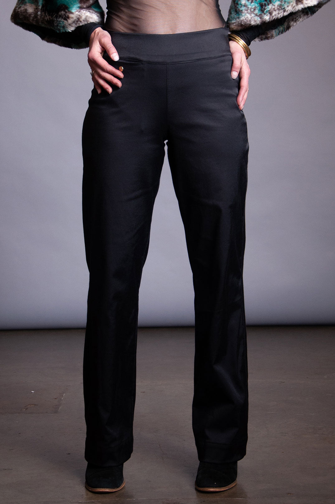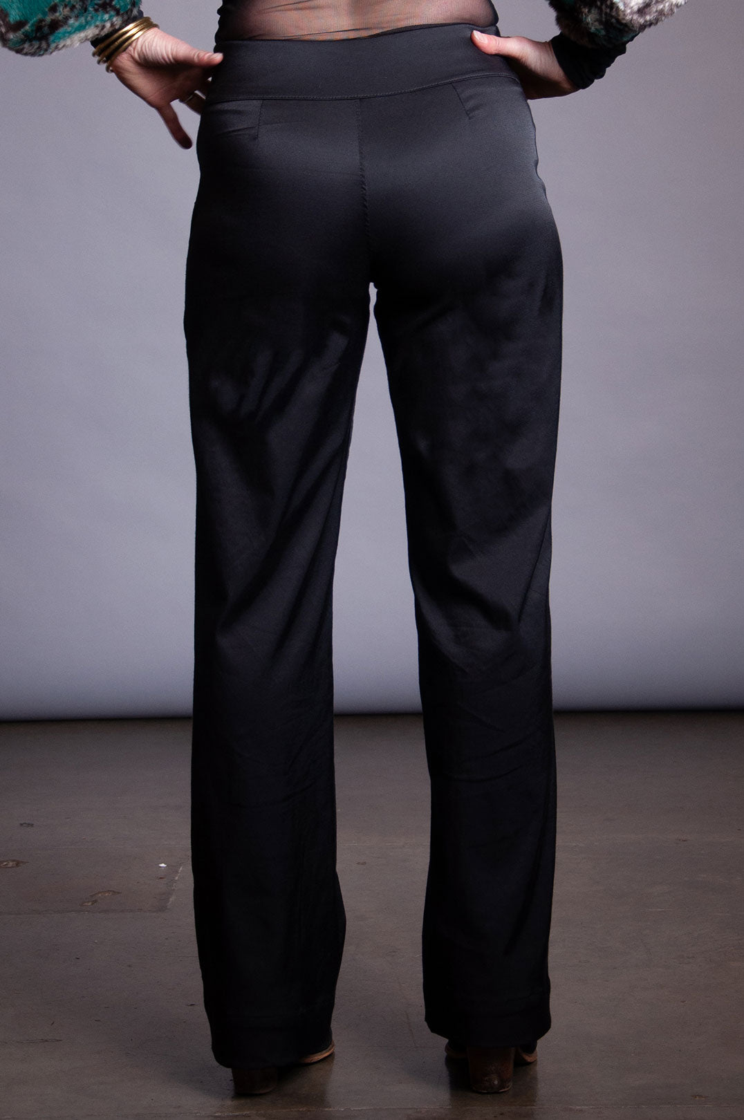 Stretch black sateen pant with wide front and back yoke at waist. Small pocket on seam snap pocket at front right yoke seam.