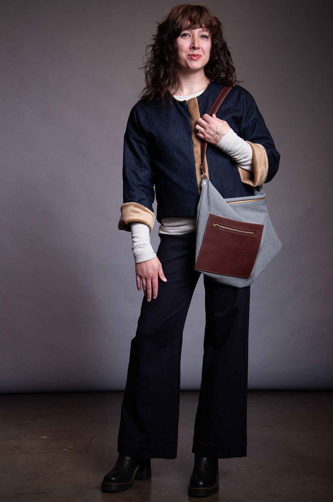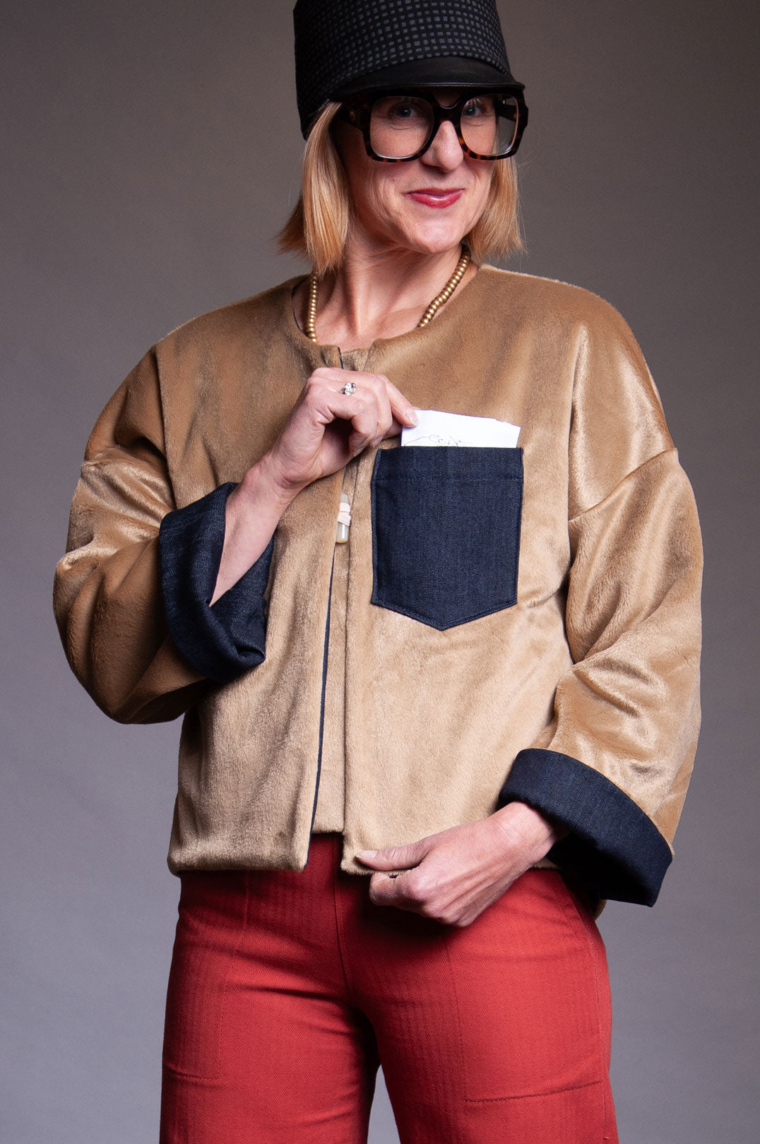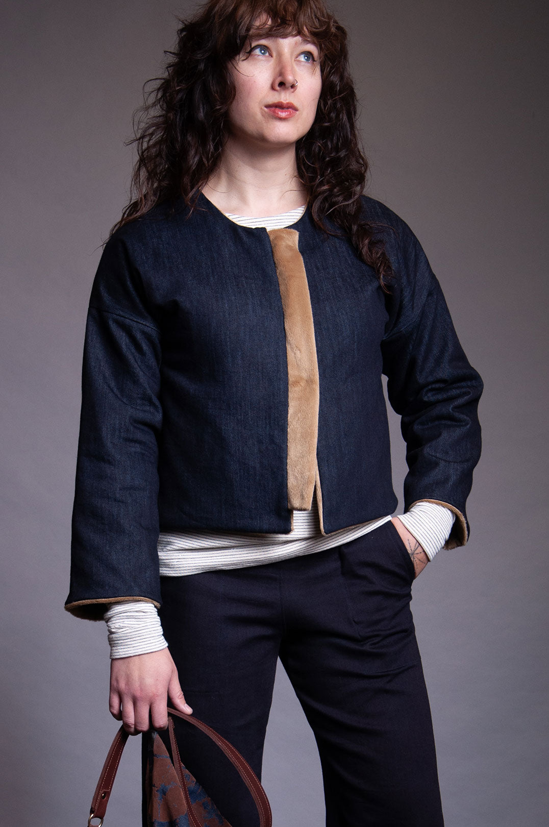 Reversible jacket with one side a luxurious tan faux fur and a denim patch chest pocket. Other side is denim with a faux fur center front placket. On seam side pockets on denim side. Bone colored toggles.