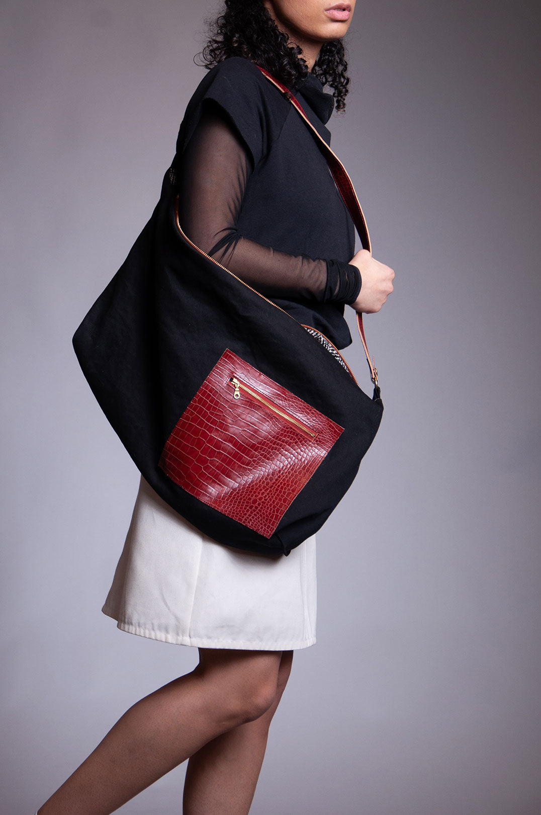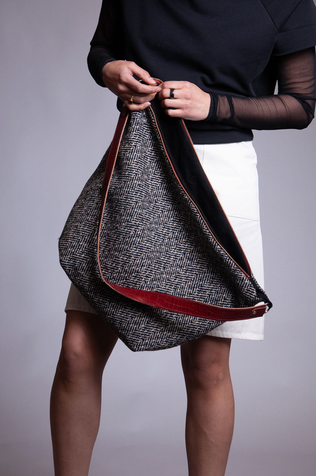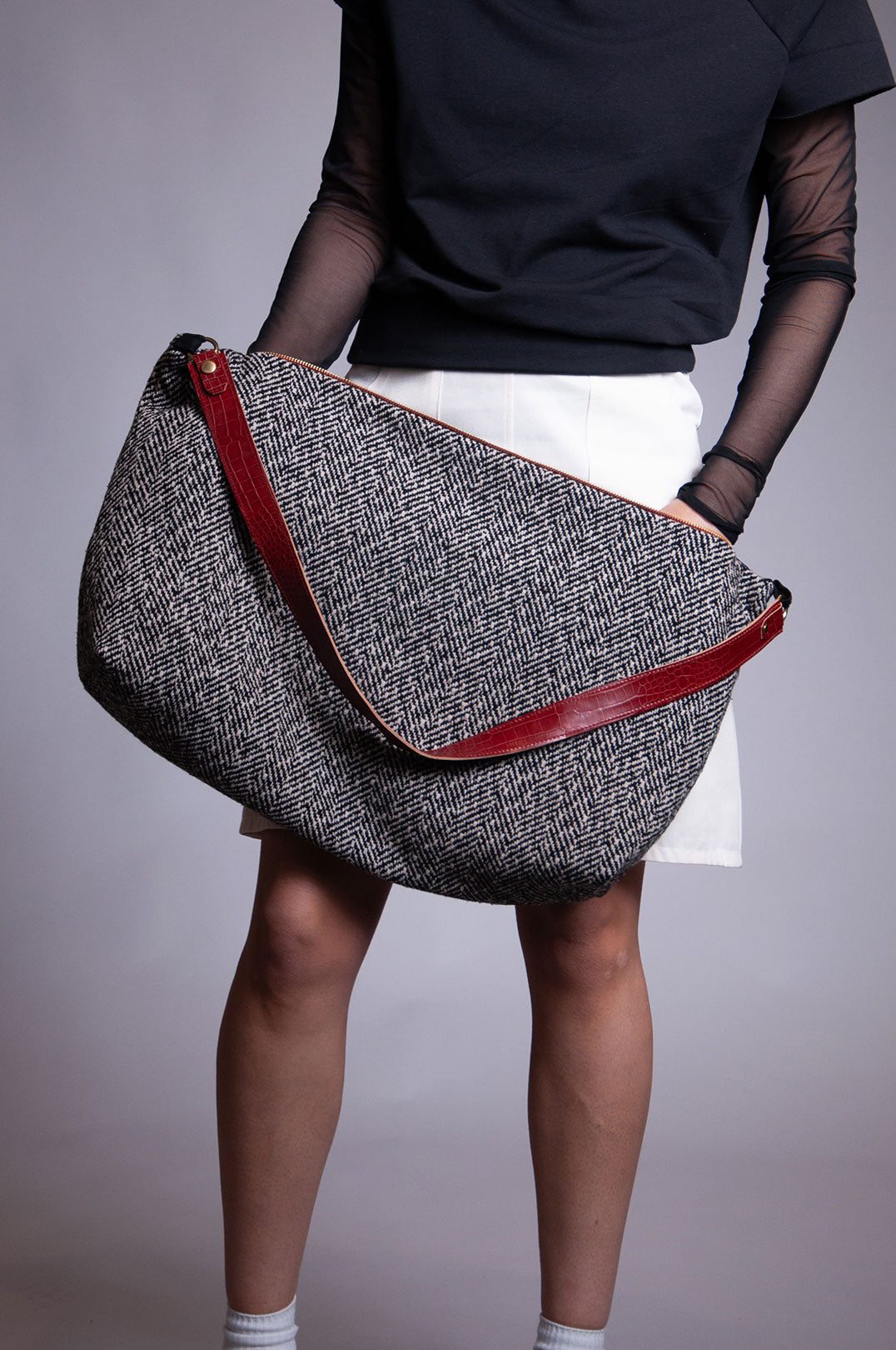Large reversible handbag with red, tan, and teal wool stripe on one side and black denim on the other. Large black leather pocket on side two. This bag will carry the kitchen sink (or at least your laptop). Black leather strap. Can be worn over the shoulder or cross body.