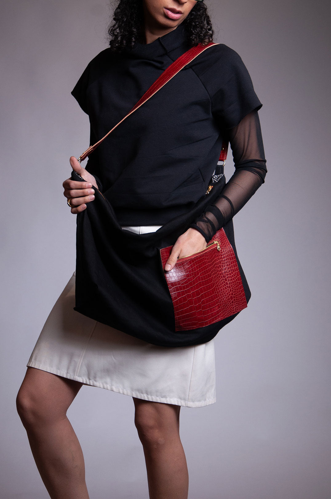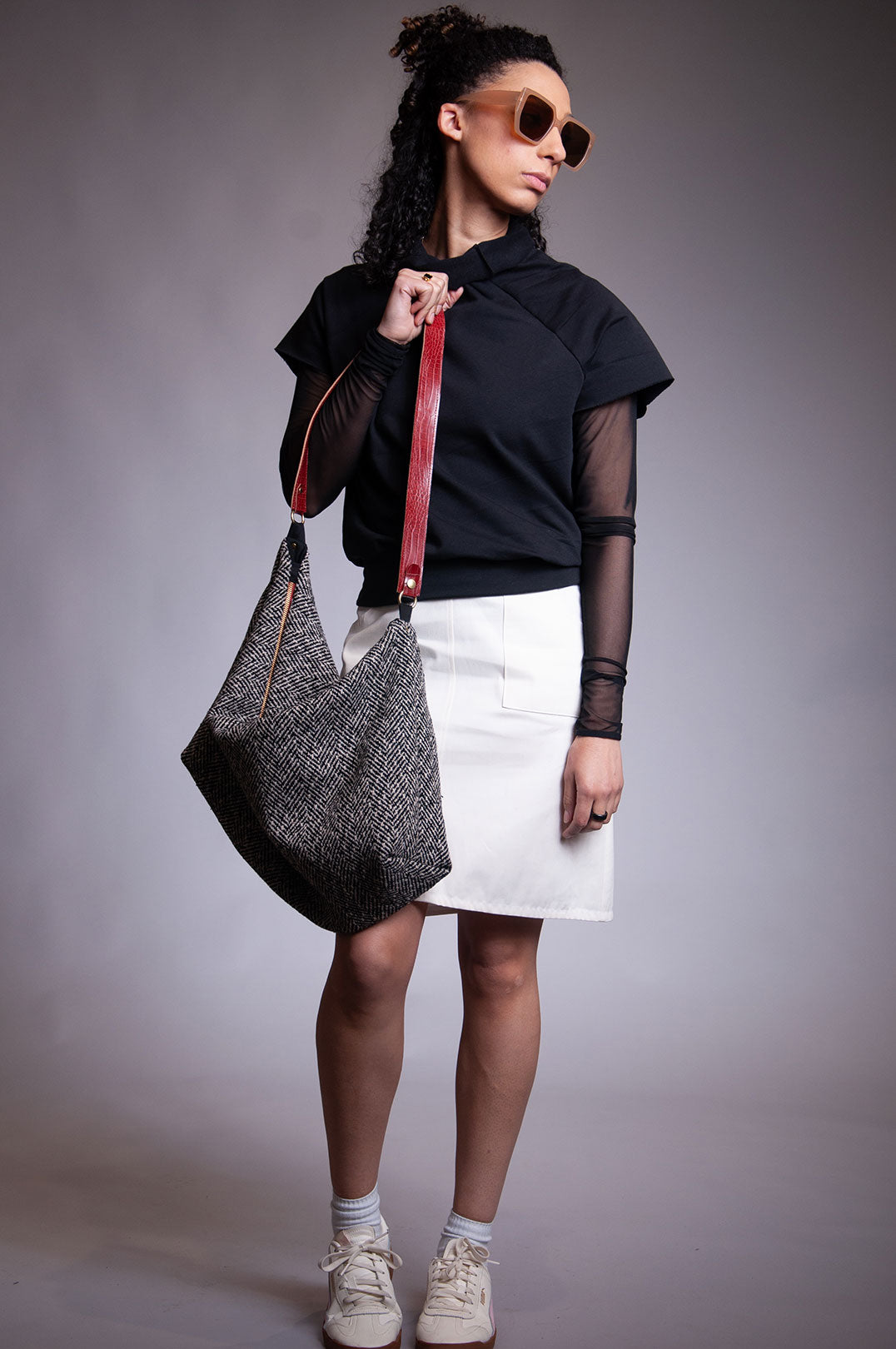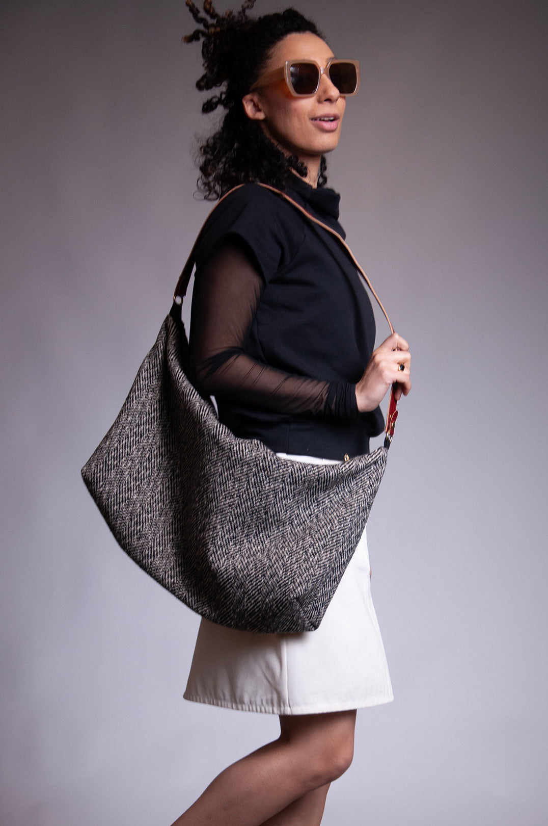 Large reversible handbag with red, tan, and teal wool stripe on one side and black denim on the other. Large black leather pocket on side two. This bag will carry the kitchen sink (or at least your laptop). Black leather strap. Can be worn over the shoulder or cross body.