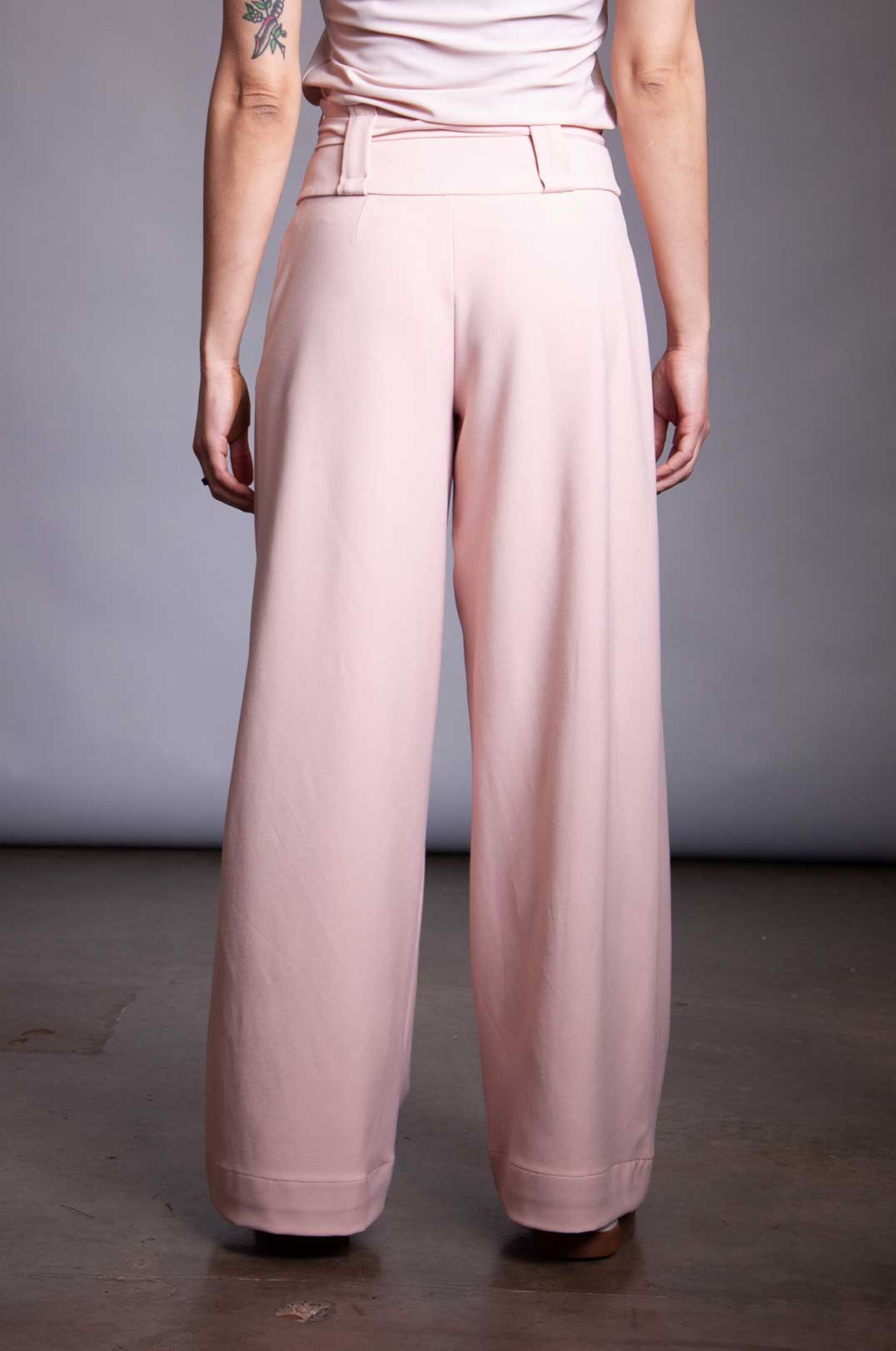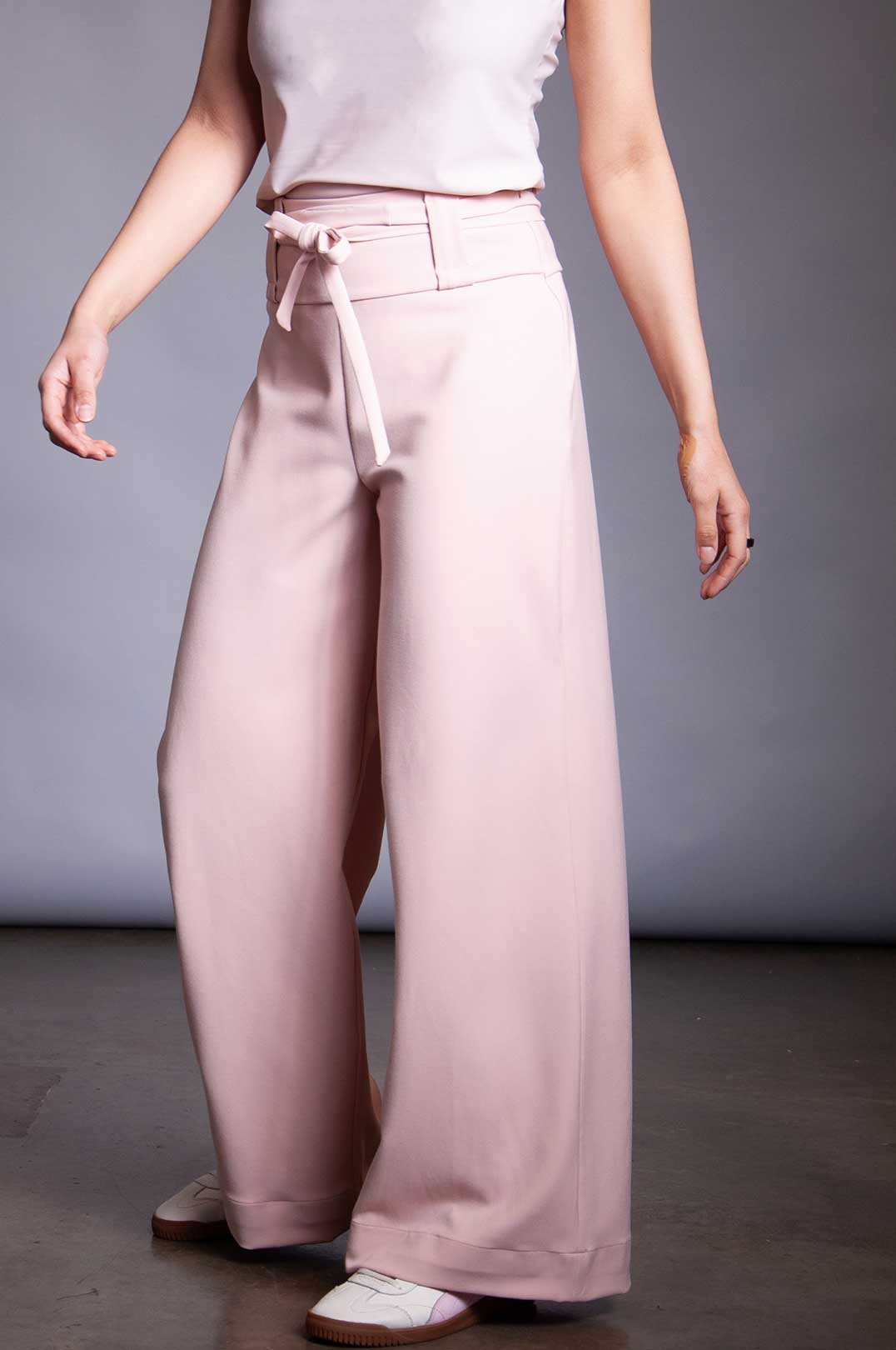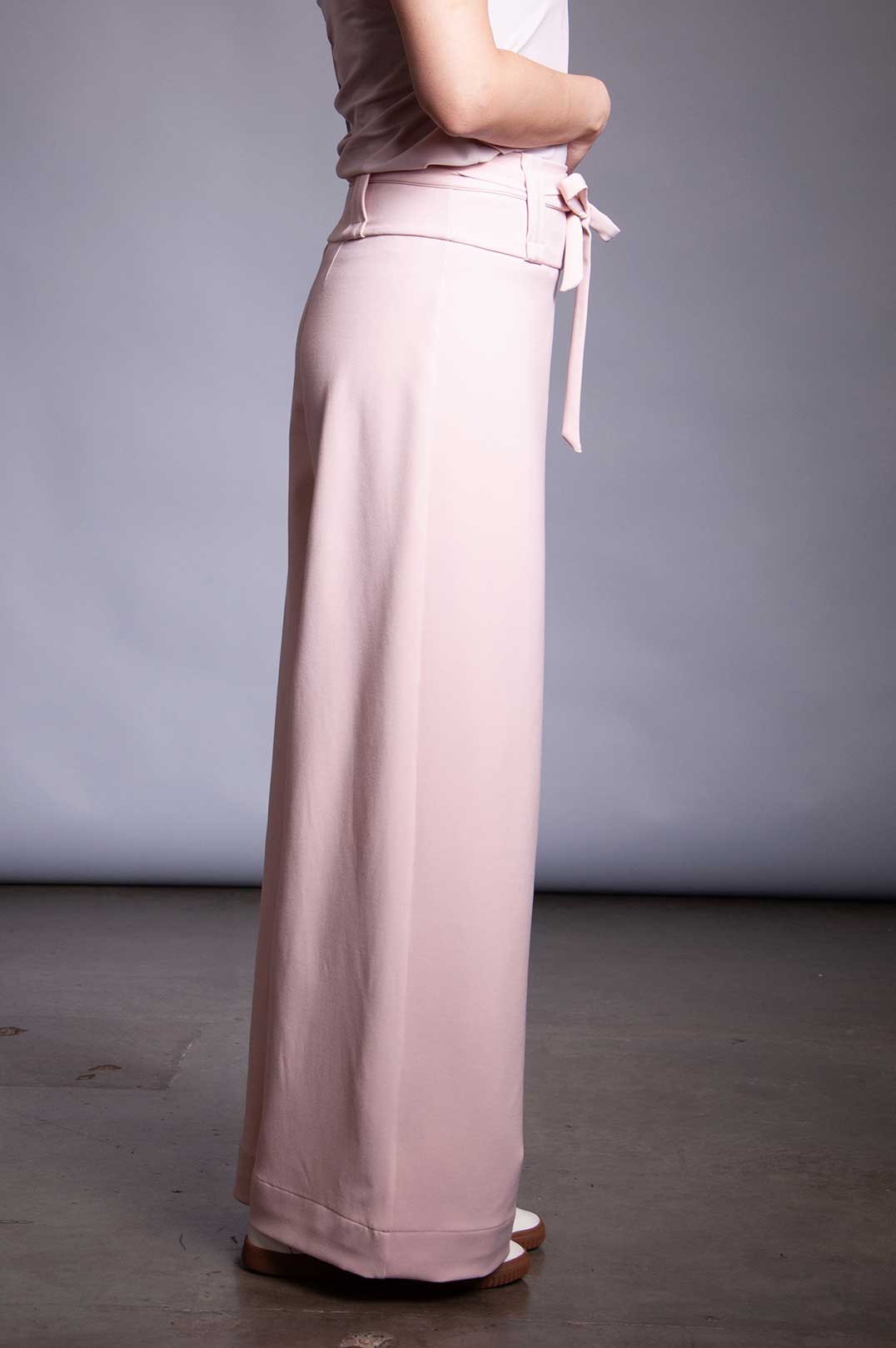 Stretch Rayon trouser with high waist, invisible side zipper, and double wrap tie belt in self-fabric. Belt can be removed and replaced with any belt up to 2" wide (if using the belt loops).