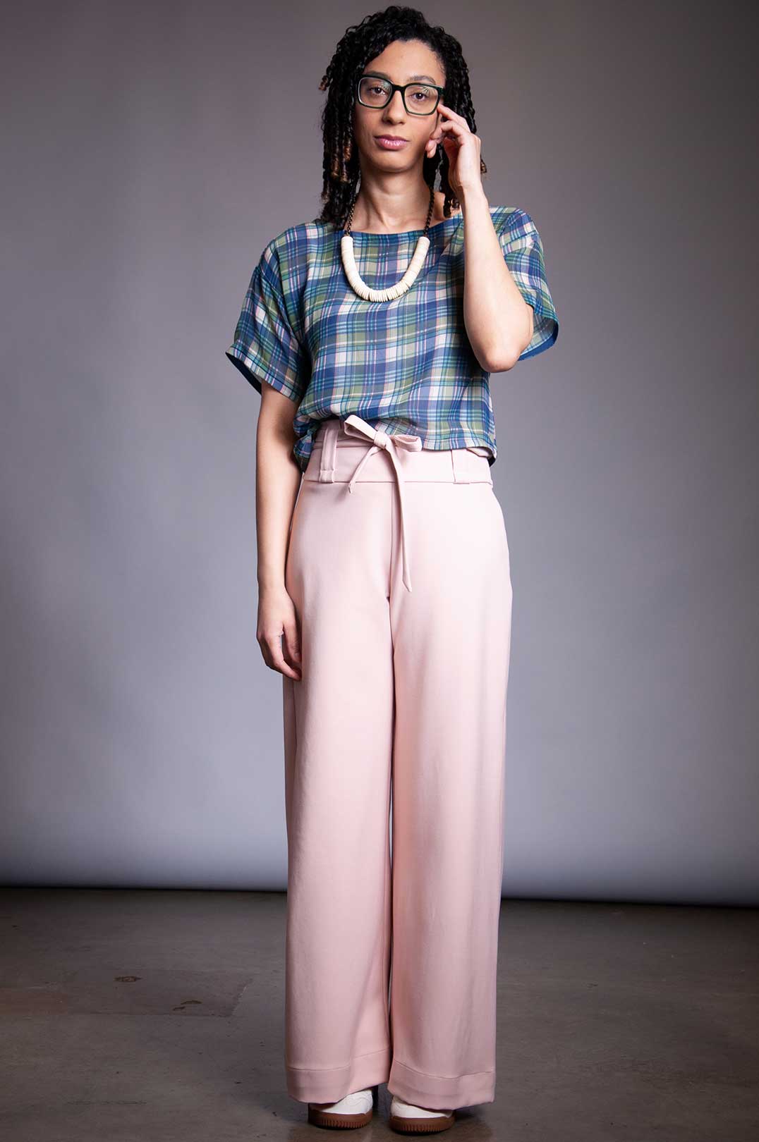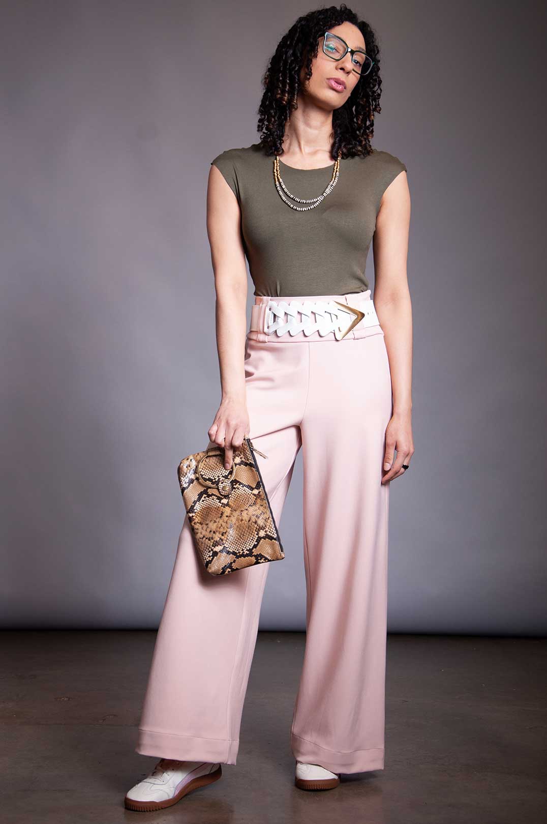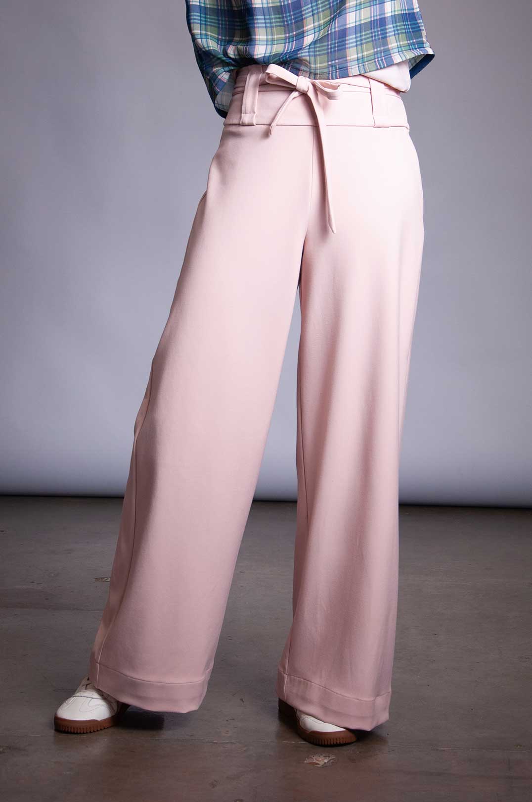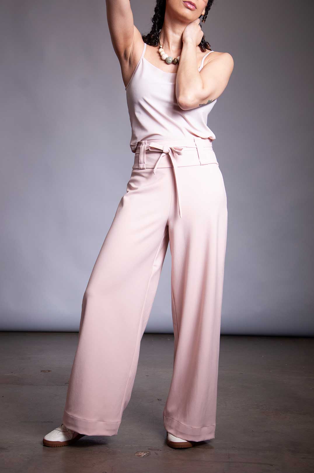 Stretch Rayon trouser with high waist, invisible side zipper, and double wrap tie belt in self-fabric. Belt can be removed and replaced with any belt up to 2" wide (if using the belt loops).