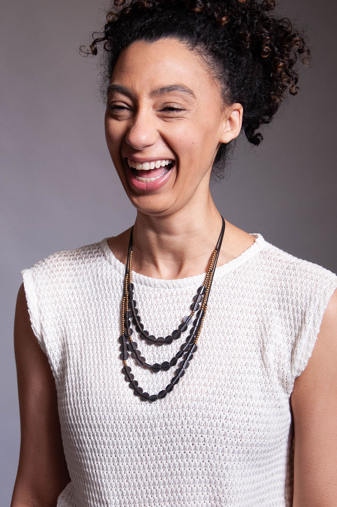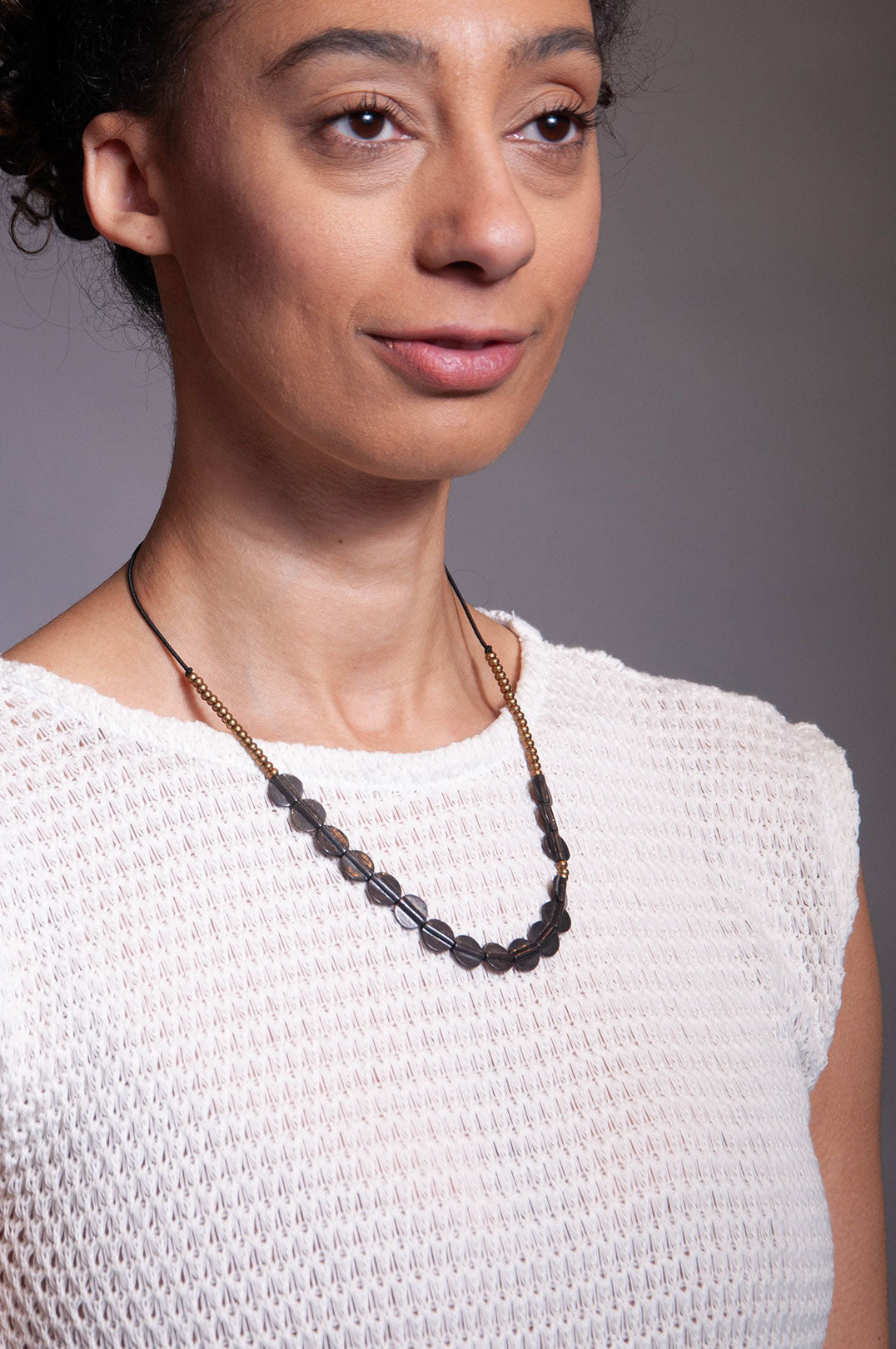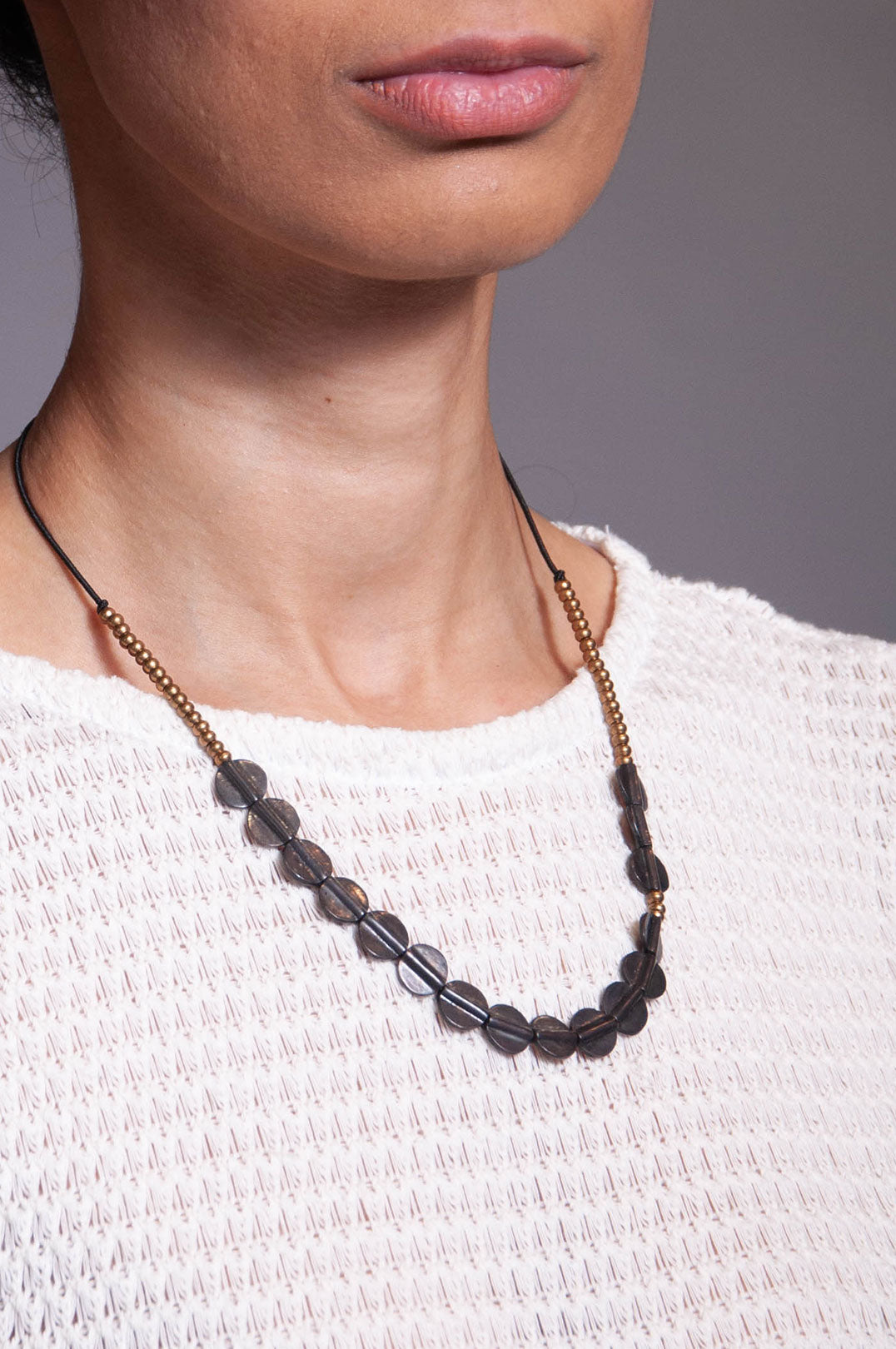Flat circle shaped black metal beads are strung between smaller brass beads. Thin elastic cording makes this necklace adjustable in length. Wear on it's own or buy several to stack. Each necklace is sold seperately.