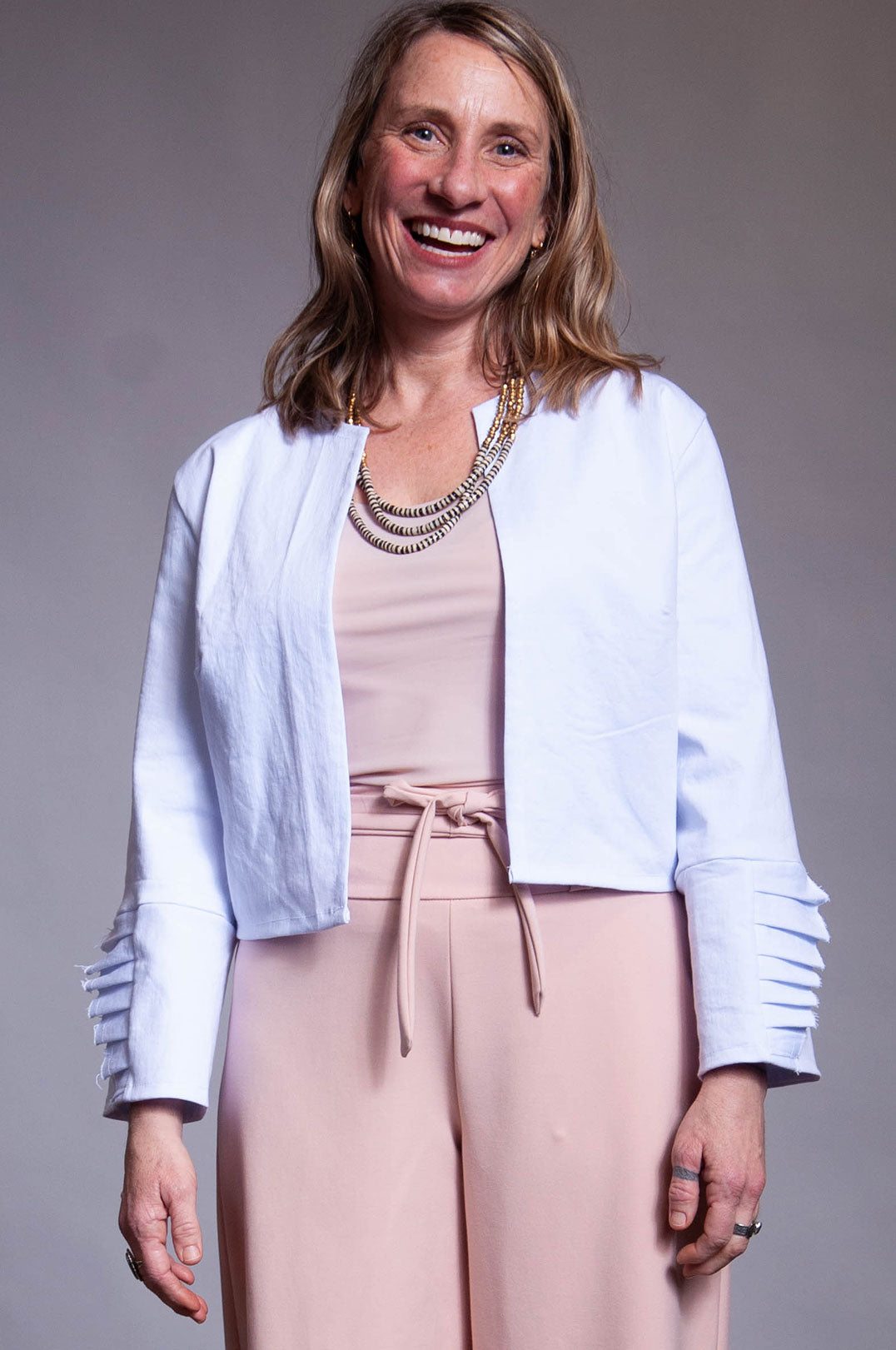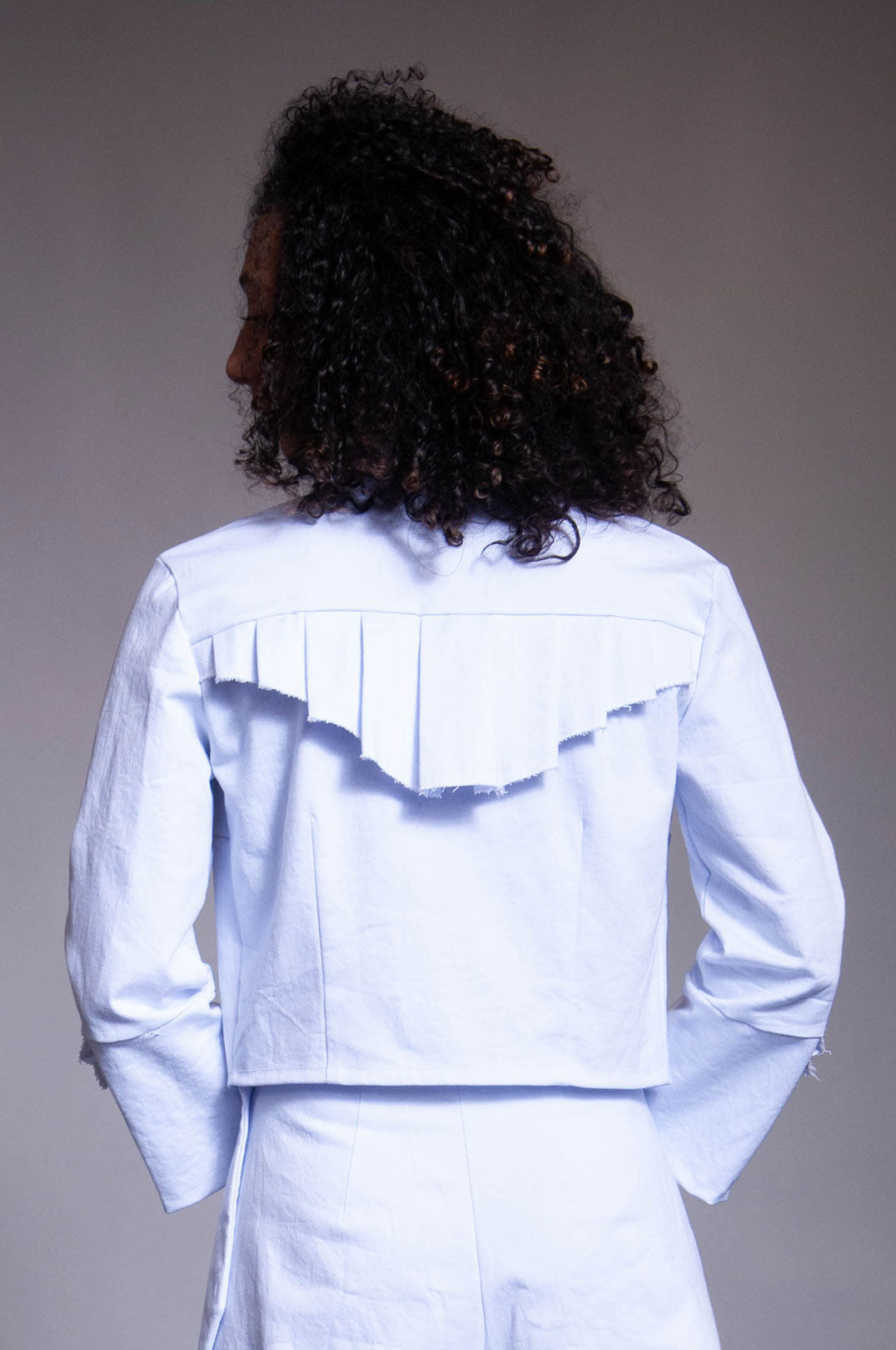 Slightly cropped open jacket made of a cool white (slightly lavendar/blue) denim. Lower sleeves and back have ruffle detail self fabric.