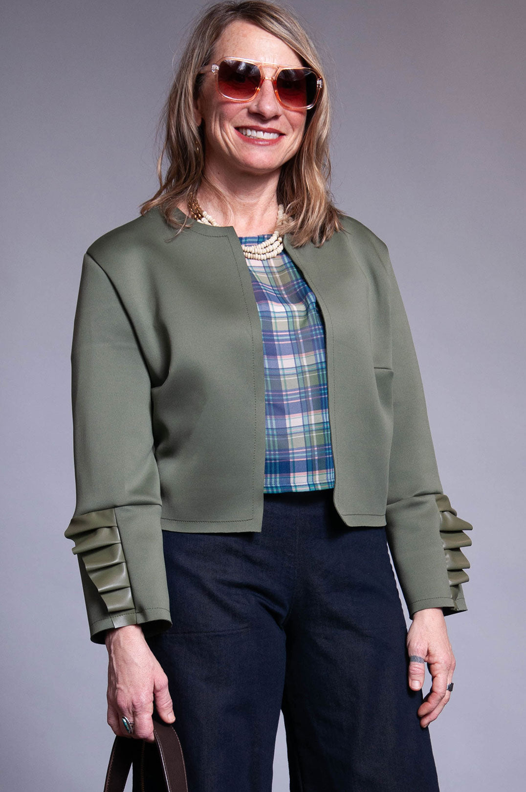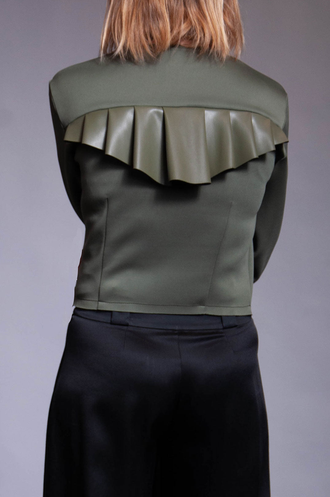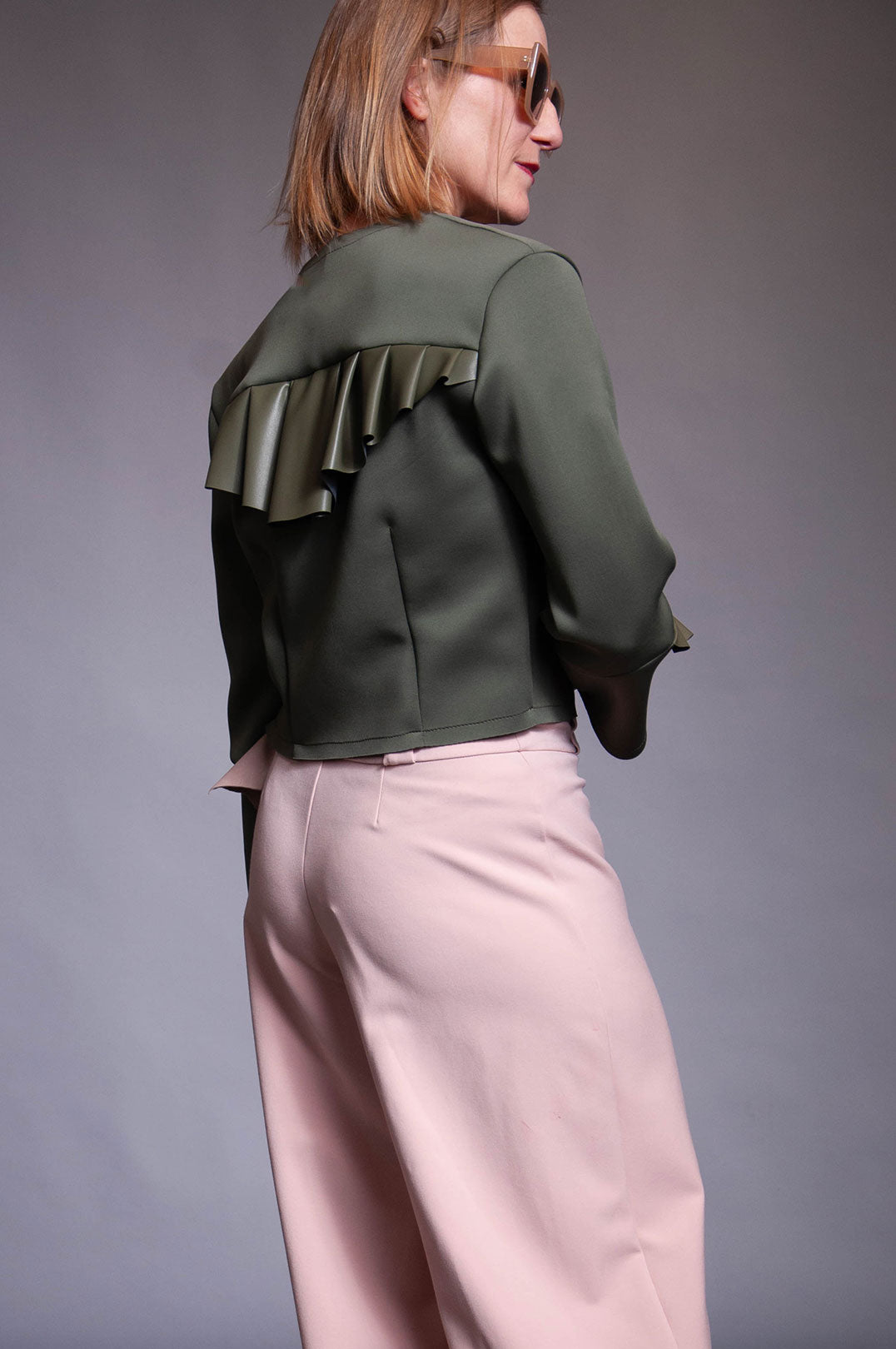 Slightly cropped open jacket made of soft, stretchy "scuba" fabric. Lower sleeves and back have ruffle detail in a vegan leather.