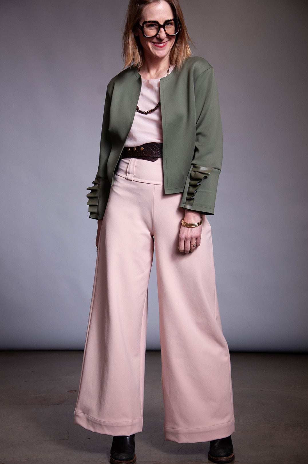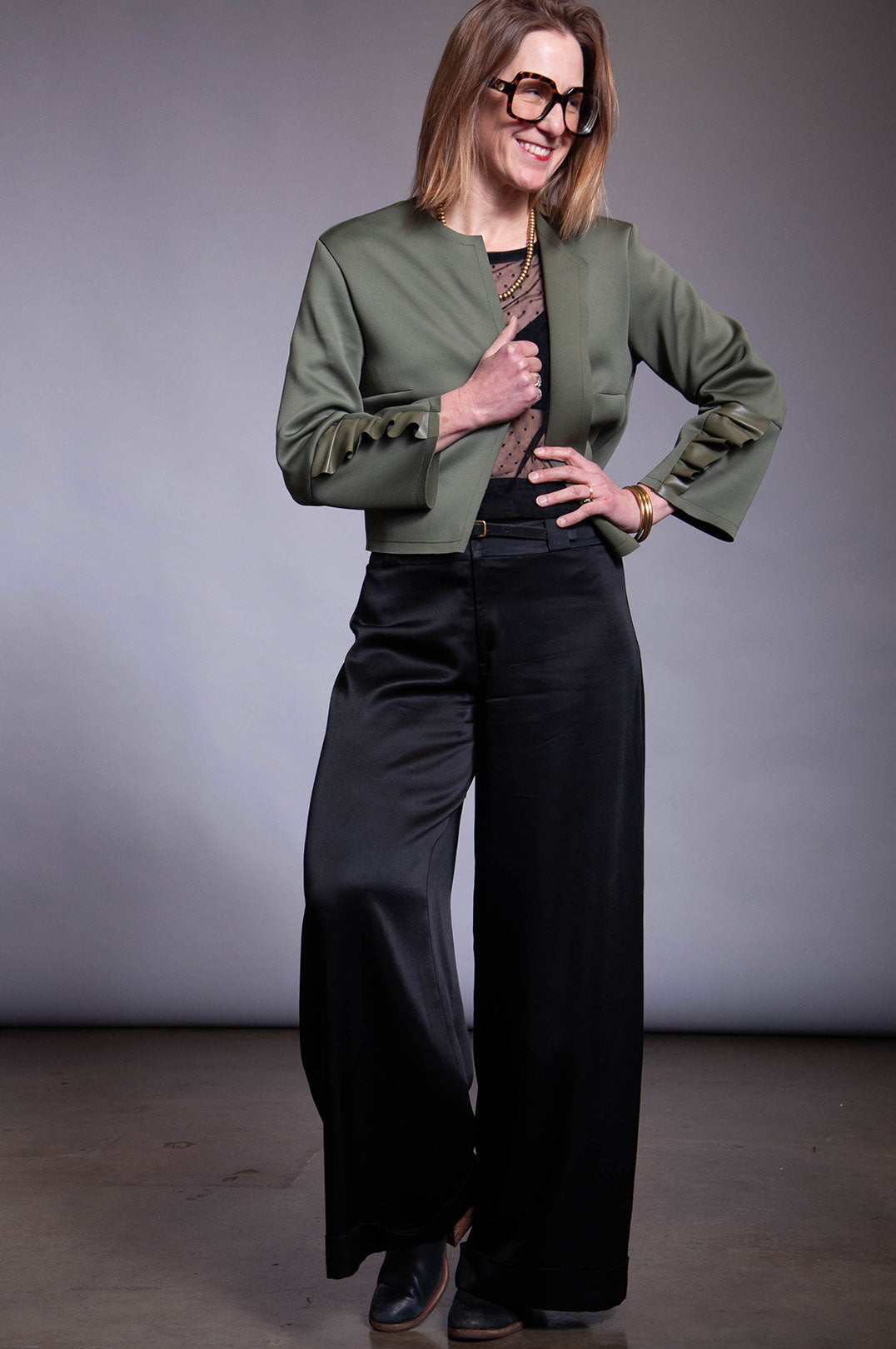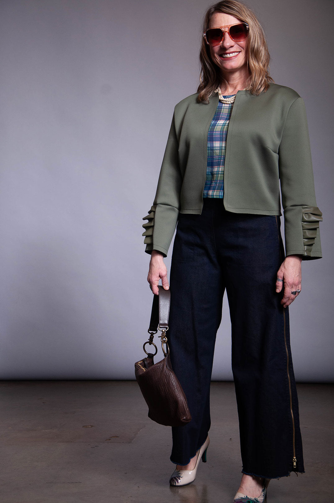 Slightly cropped open jacket made of soft, stretchy "scuba" fabric. Lower sleeves and back have ruffle detail in a vegan leather.