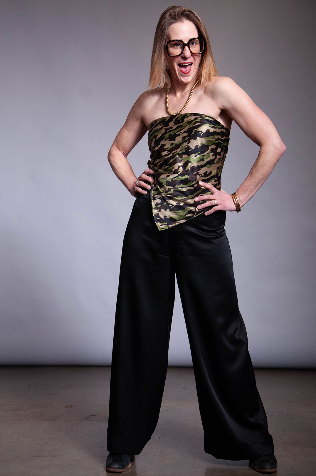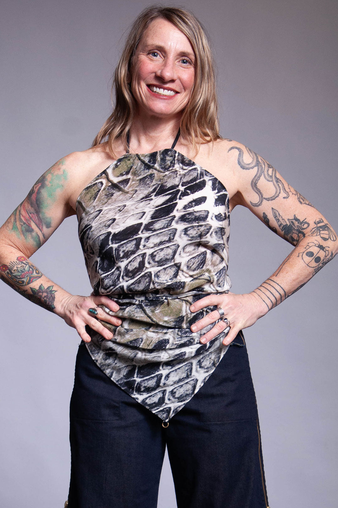 The Silk Scarf Top can be worn as a scarf or a top. There are brass rings in opposite corners with removable long silk self fabric ties. The third corner has a fabric sleeve with two options for sizing and another fabric tie, this one in black. There are several ways to wear this piece (i.e. as a bandeau or a bandana), so if you are curious to learn more just call us! 503.954.2292.