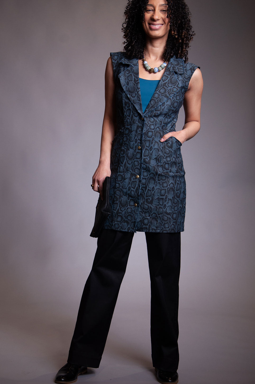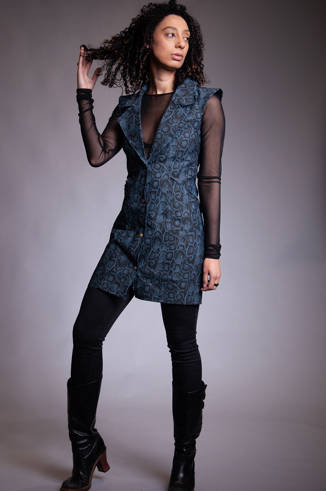 Sleeveless blazer-style dress that can also be worn as a long vest. Raw edges at front lapel and front pockets. Slightly elevated and extended shoulders give a slight nod to the '80s. Deep v-neck with 4 brass snaps as a closure.